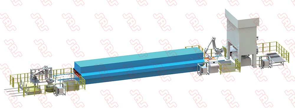 線首拆垛單元 2x可移動式拆垛臺車 2x手動磁力臂自動分張系統 1x 6軸機器人 1x拆垛端拾器(通用式) 1x雙張檢測系統 1x打碼系統 烤爐及對中單元 1x加熱爐及對中系統(客戶自備) 上料單元 1x 6軸機器人 1x上料機器人端拾器 | 線尾收料單元 1x 6軸機器人 1x下料機器人端拾器 1x收料皮帶機 安全防護單元 1x整線安全圍欄 1x整線安全鎖及控制 電氣控制單元 1x總控制系統 3x沖壓機器人自動化專用軟件QuickStamp |