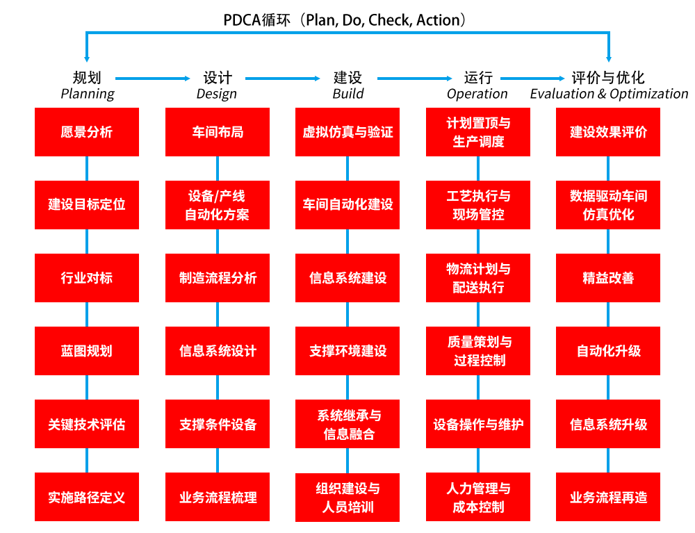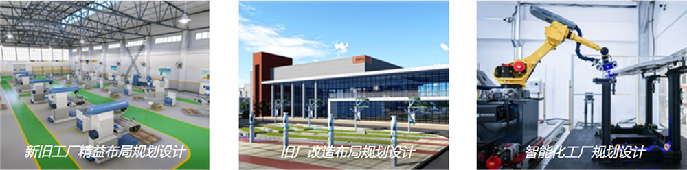 信息化(MES)與自動化協同生產,3D建模及動畫仿真優化,工廠精益化布局規劃,智慧物流系統。
